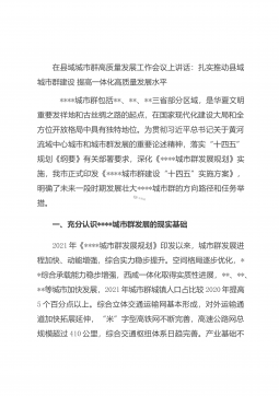 在县域城市群高质量发展工作会议上讲话:扎实推动县域城市群建设提高一体化高质量发展水平 ****城市群包括**、**、**三省部分区域,是华夏文明重要发祥地和古丝绸之路的起点,在国家现代化建设大局和全方位开放格局中具有独特地位。为贯彻习近平总书记关于黄河流域中心城市和城市群发展的重要论述精神,落实“十四五”规划《纲要》有关部署要求,深化《****城市群发展规划》实施,我市正式印发《****城市群建设“十四五”实施方案》,明确了未来一段时期发展壮大****城市群的方向路径和任务举措。一、充分认识****城市群发展的现实基础2021年《****城市群发展规划》印发以来,城市群发展进程加快、动能增强,...
