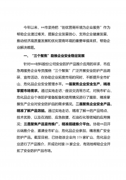 今年以来,**市坚持把“创优营商环境为企业服务”作为帮助企业渡过难关,提振企业发展信心,支持企业健康发展,推动经济高质量发展和优化营商环境的重要举措来抓,帮助企业解决难题。一、“三个聚焦”助推企业安全稳定发展针对***材料股份公司安全防护产品推介应用的诉求,市应急局服务企业专员围绕“三个聚焦”广泛开展安全防护产品调研、宣传活动,在协助企业拓宽市场的同时,不断提升全市矿山、危化品企业安全管理水平。一是聚焦企业安全生产,精准掌握市场需求。通过实地走访、座谈交流等方式,对我市矿山、危化品企业个体防护装备配备和使用情况进行了摸排,精准掌握生产企业对安全防护品的需求情况。二是聚焦企业安全产品,精准了解产...