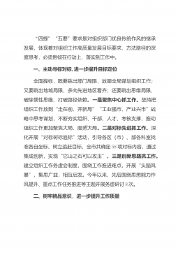 “四提”“五要”要求是对组织部门优良传统作风的继承发展,体现着对组织工作高质量发展目标要求、方法路径的深度思考,必须贯彻在行动上、落实到工作中。一、主动寻标对标,进一步提升目标定位全面提标,既要跳出部门局限,放眼全局谋划组织工作;又要跳出地域局限,多向先进地区看齐;还要跳出思维局限,破除惯性思维、打破路径依赖。一是聚焦中心抓工作。坚持把组织工作放到“走在前、开新局”“工业强市、产业兴市”战略中思考谋划,不断夯实组织、干部、人才、考核支撑,推动组织工作更加聚焦大局、服务大局。二是对标先进抓工作。深化开展“对标树标追标”活动,引导各区(市)、部各科室找准各自坐标、树立追赶目标,全市共确定58项对标...