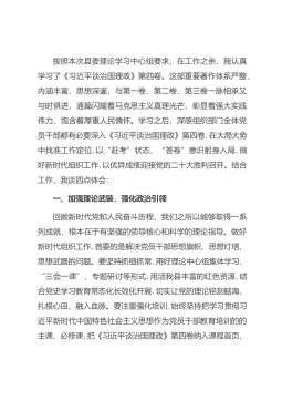 按照本次县委理论学习中心组要求,在工作之余,我认真学习了《习近平谈治国理政》第四卷。这部重要著作体系严整、内涵丰富、思想深邃,与第一卷、第二卷、第三卷一脉相承又与时俱进,通篇闪耀着马克思主义真理光芒、彰显着强大实践伟力、饱含着厚重人民情怀。学习之后,深感组织部门全体党员干部都有必要深入《习近平谈治国理政》第四卷,在大局大势中找准工作定位,以“赶考”状态、“答卷”意识躬身入局,做好新时代组织工作,以优异成绩迎接党的二十大胜利召开。结合工作,我谈四点体会:一、加强理论武装,强化政治引领回顾新时代党和人民奋斗历程,我们之所以能够取得一系列成就,根本在于有坚强的领导核心和科学的理论指导。做好新时代组织...
