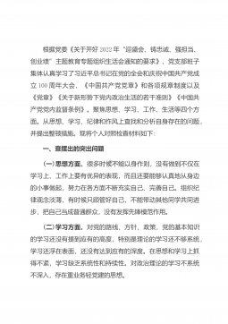 根据党委《关于开好2022年“迎盛会、铸忠诚、强担当、创业绩”主题教育专题组织生活会通知的要求》,党支部班子集体认真学习了习近平总书记在党的全会和庆祝中国共产党成立100周年大会、《中国共产党党章》和各项规章制度以及《党章》《关于新形势下党内政治生活的若干准则》《中国共产党党内监督条例》。聚焦思想、学习、工作、生活等四个方面。从思想、学习、纪律和作风上查找和分析自身存在的问题,并提出整顿措施。现将个人对照检查材料如下:一、查摆出的突出问题(一)思想方面。很多时候不能以身作则,没有做到不仅在学习上、工作上要有优异的表现,而且还要能够认真地从身边的小事做起,努力在各方面不断充实自己、完善自己。组织...