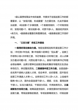 *县认真贯彻落实中央和省委、市委关于巡视巡察工作的部署要求,以“发现问题、形成震慑”为主要任务,扎实开展政治巡察,*轮巡察*个乡镇党委、*个县直党组织、*个村级党组织,发现问题*个,移交线索*条,问责干部*人,挽回经济损失*余万元,*届县委全覆盖任务圆满完成,*届县委巡察工作良好开局。一、“三支力量”夯实工作基础一是用好高位推动力量。制定巡察规划和年度巡察工作计划,*年任务*年完成,第*年抽取*%的单位“回头看”。巡察工作领导小组*次听取汇报,书记专题会*次听取汇报,点人点事交办重点问题*项,问责处理干部*人。县级干部列席书记专题会领会精神,出席分管单位巡察反馈会和整改专题民主生活会传导压力,...