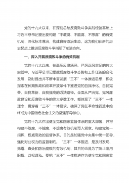 党的十九大以来,在深刻总结反腐败斗争实践经验基础上习近平总书记提出要构建“不敢腐、不能腐、不想腐”的有效机制,深化标本兼治,构建良好政治生态,这为我们在新的历史起点上推进反腐败斗争指明了前进方向。一、深入开展反腐败斗争的有效机制党的十八大以来,在高压反腐惩恶、严厉正风肃纪的伟大实践中,习近平总书记根据反腐败斗争态势和工作任务的变化发展,及时提出并不断丰富发展“三不”一体推进思想,积极探索在长期执政和改革开放条件下推进党的自我净化、自我完善、自我革新、自我提高的方法路径。全面从严治党、党风廉政建设和反腐败斗争的绝大多数工作,都体现了“三不”一体理念,贯穿着“三不”一体要求,确保了党在革命性锻造中...