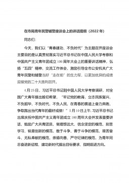 在市局青年民警辅警座谈会上的讲话提纲(2022年)同志们:今天,我们以“青春建功、不负时代”为主题召开座谈会主要目的是认真贯彻落实习近平总书记在中国人民大学考察和中国共产主义青年团成立100周年大会上的重要讲话精神,弘扬“五四”精神,交流工作体会,激励引导全市公安机关广大青年民警和辅警当好“走在前”的生力军,以更加优异的成绩迎接党的二十大胜利召开。4月25日,习近平总书记到中国人民大学考察调研,对全国广大青年提出殷切希望,“牢记党的教诲,立志民族复兴,不负韶华,不负时代,不负人民,在青春的赛道上奋力奔跑,争取跑出当代青年的最好成绩!”5月10日上午,习近平总书记出席庆祝中国共产主义青年团成立1...