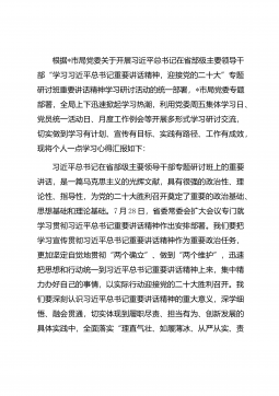 根据*市局党委关于开展习近平总书记在省部级主要领导干部“学习习近平总书记重要讲话精神,迎接党的二十大”专题研讨班重要讲话精神学习研讨活动的统一部署,*市局党委专题部署,全局上下迅速掀起学习热潮,利用党委周五集体学习日、党员统一活动日、月度工作例会等开展多形式学习研讨交流,切实做到学习有计划、宣传有目标、实践有路径、工作有成效,现将个人一点学习心得汇报如下:习近平总书记在省部级主要领导干部专题研讨班上的重要讲话,是一篇马克思主义的光辉文献,具有很强的政治性、理论性、指导性,为党的二十大胜利召开奠定了重要的政治基础、思想基础和理论基础。7月28日,省委常委会扩大会议专门就学习贯彻习近平总书记重要讲...
