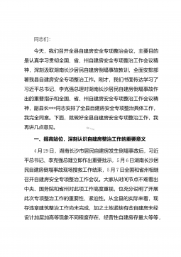 同志们:今天,我们召开全县自建房安全专项整治会议,主要目的是认真学习贯彻全国、省、州自建房安全专项整治工作会议精神,深刻汲取湖南长沙居民自建房倒塌事故教训,全面安排部署我县自建房安全专项整治工作。刚才,我们书面传达学习了习近平总书记、李克强总理对湖南长沙居民自建房倒塌事故作出的重要指示和全国、省、州自建房安全专项整治工作会议精神,副县长***同志安排了全县自建房安全专项整治具体工作,我完全同意。下面,就做好全县自建房安全专项整治工作,我再讲几点意见。一、提高站位,深刻认识自建房整治工作的重要意义4月29日,湖南长沙市居民自建房发生倒塌事故后,习近平总书记、李克强总理立即作出重要批示,5月6日湖...