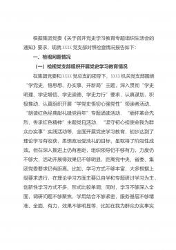 根据集团党委《关于召开党史学习教育专题组织生活会的通知》要求,现就XXXX党支部对照检查情况报告如下:一、检视问题情况(一)检视党支部组织开展党史学习教育情况在集团党委和XXXX党总支的领导下,XXXX机关党支部围绕“学党史、悟思想、办实事、开新局”主题,深入贯彻“学史明理、学史增信、学史崇德、学史力行”要求,认真谋划,积极推动,认真组织开展“学党史悟初心强党性”领读者活动、“朗读红色经典献礼建党百年”专题诵读活动、“缅怀革命先烈,传承红色精神”主题党日活动、“坚守初心担使命我为群众办实事”实践活动等,全面开展党史学习教育,初步达到了理论学习有收获,思想政治受洗礼的目标,虽取得了阶段性成效。但...