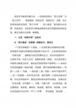 党史学习教育开展以来,xx区始终坚持以“民之所望”为“政之所向”,紧紧围绕“民有所呼,我有所行”主题,充分发挥党组织和党员“两个作用”,深入推进“我为群众办实事”实践活动,切实把学习教育成果转化成为民服务的实际成效,真正为群众办实事、解难题。一、立足“问需于民”出发点让“战斗堡垒”在基层一线聚合力、增活力一个党支部就是一个堡垒。xx区紧盯群众急难盼愁问题,持续提升党建引领基层治理的能力和水平,让各领域党组织“互联互通”,凝聚起为民办实事的合力。在机关党组织中,以领导干部“社区工作日”制度和党委(党组)书记党支部工作联系点制度为抓手,推动全区各级领导干部带领xxxx余名机关党员到基层一线找问题、...