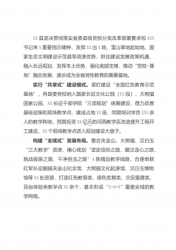 XX县坚决贯彻落实省委县级党校分类改革部署要求和XXX书记来X重要指示精神,发挥XX出X地、雪山草地起始地、国家生态文明建设示范县等资源优势,抓住建设发展政策机遇,融入长远规划、发挥本土优势、强化底部支撑,推动“党校+基地”融合发展,逐步成为全省党性教育的重要基地。实行“共享式”建设模式。紧盯建设“全国红色教育示范基地”,将县委党校纳入国家长征文化公园(XX段)、大熊猫国家公园、XX长征干部学院“三项规划”统筹建设,借力改善基础设施和现场教学点,建成占地XX亩、同期培训学员XXX余人的教学阵地,预算投资XX亿元的河西教学区改造提升工程开工建设,XX个现场教学点进入规划建设大盘子。构建“全域式”...