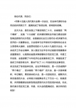 各位代表、同志们:*市第十五届人民代表大会第一次会议,在全体代表和与会同志的共同努力下,圆满完成了各项议程,即将胜利闭幕。这次大会,是在全国上下喜迎党的二十大,全省锚定“两个确保”、实施“十大战略”的关键时期和全市奋力建设创新型高品质现代化示范区、全面建设社会主义现代化*的关键节点,召开的一次重要会议。大会高举习近平新时代中国特色社会主义思想伟大旗帜,全面贯彻党的十九大和十九届历次全会、中央经济工作会议精神,深入落实习近平总书记视察河南重要讲话重要指示,认真落实省委决策部署和示范区党工委、市委工作安排,全面部署了今年经济社会发展各项工作,审查批准了政府工作报告等文件,票决产生了2022年政府民...