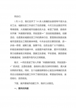 同志们:3月26日,我们召开了700多人规模的全县领导干部大会,对工业、城建攻坚工作进行了动员部署。今天又在这里召开同等高规格、大规模的城市创建动员大会,彰显了县委、县政府对开展“共建美好家园,同创宜居**”活动的高度重视。创建活动,也是落实城建攻坚工作的具体行动,更是落实我县实施城市宜居宜业工程的具体举措。今天会议的主要目的是,进一步统一思想、凝聚力量、鼓舞干劲,动员全县广大干部群众,积极投身到城市创建中来,全面提升城市形象、提升市民素质,努力创建省级文明县城、国家卫生县城、平安县城、美丽县城和畅通县城,加快提升现代化文明程度。刚才,**同志宣读了深入开展“共建美好家园,同创宜居**”的决定...