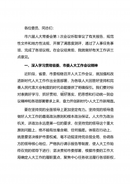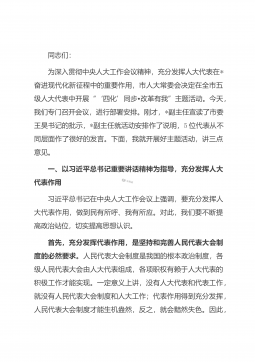 同志们:为深入贯彻中央人大工作会议精神,充分发挥人大代表在*奋进现代化新征程中的重要作用,市人大常委会决定在全市五级人大代表中开展“‘四化’同步•改革有我”主题活动。今天,我们专门召开会议,进行部署安排。刚才,*副主任宣读了市委王昊书记的批示,*副主任就活动安排作了说明,5位代表从不同层面作了很好的发言。下面,我就开展好主题活动,讲三点意见。一、以习近平总书记重要讲话精神为指导,充分发挥人大代表作用习近平总书记在中央人大工作会议上强调,要充分发挥人大代表作用,做到民有所呼、我有所应。对此,我们要不断提高政治站位,切实提高思想认识。首先,充分发挥代表作用,是坚持和完善人民代表大会制度的必然要求。...
