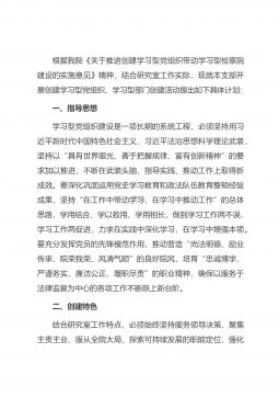 根据我院《关于推进创建学习型党组织带动学习型检察院建设的实施意见》精神,结合研究室工作实际,现就本支部开展创建学习型党组织、学习型部门创建活动提出如下具体计划:一、指导思想学习型党组织建设是一项长期的系统工程,必须坚持用习近平新时代中国特色社会主义、习近平法治思想科学理论武装,坚持以“具有世界眼光、善于把握规律、富有创新精神”的要求加以推进,不断在武装头脑、指导实践、推动工作上取得新成效。要深化巩固运用党史学习教育和政法队伍教育整顿经验成果,坚持“在工作中带动学习,在学习中推动工作”的总体思路,学用结合、学以致用、学用相长,做到学习工作两不误,学习工作两促进,力求在实践中深化学习,在学习中增强...