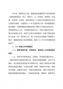 今年来,我局在区工委、管委会的坚强领导下和市退役军人事务局的指导、关心、帮助下,以“学党史、悟思想、办实事、开新局”为目标,始终坚持以XXX新时代中国特色社会主义思想为指导,认真落实XXX关于退役军人的一系列重要指示批示精神,准确把握新时期退役军人事务工作的定位和方向,紧紧围绕中心工作,不断强化思想认识、夯实干部队伍作风、提升业务能力水平,各项工作有力有序推进,实现了辖区退役军人赴省(市)进京零上访,进一步在全社会营造了尊崇军人职业、尊重退役军人的浓厚氛围。现将2021年工作开展情况总结如下:一、2021年度工作开展情况(一)聚焦党建引领,求真务实,退役军人工作基础逐步夯实。1.以“党史学习教...