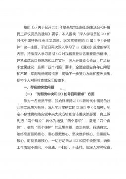 按照《xx关于召开2021年度基层党组织组织生活会和开展民主评议党员的通知》要求,本人围绕“深入学习贯彻XXX新时代中国特色社会主义思想,学习贯彻党的XX届X中X会精神”这一主题,于近日再次深入学习了xx《通知》规定的学习内容,持续深入学习贯彻XXX对我省重要讲话重要指示精神,并紧密结合自身思想和工作实际,深入开展谈心谈话,广泛征求意见建议,按照“四个对照”要求,全面查摆自身存在问题和不足,深刻剖析问题根源,明确下一步努力方向和整改措施。现将个人对照检查情况汇报如下:一、存在的突出问题(一)“对照党中央和XXX的号召和要求”方面作为一名党员干部,我始终坚持以XXX新时代中国特色社会主义思想为指...