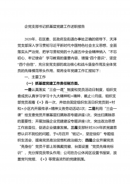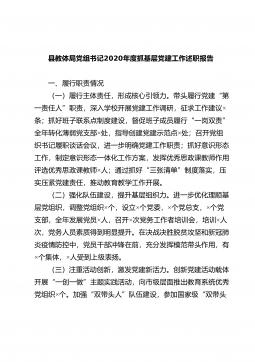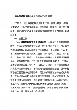 社区党总支书记抓基层党建工作述职报告2020年,我认真履行基层党建工作第一责任人职责,抓亮点求突破,不断夯实党建基础,积极奉献、忠实履行自己的工作职责,为促进社区各项工作健康有序开展提供了有力保障。现述职如下:一、主要工作(一)抓基层党建工作责任制方面。一是主动学习新思想新精神,多层面开展专题学习活动、党小组学习讨论会、书记领学举办知识竞赛、文艺汇演等多种形式推进“不忘初心、牢记使命”主题教育常态化制度化,增强“四个意识”、坚定“四个自信”、落实“两个维护”,贯彻落实习近平总书记重要批示精神全年开展专题集中学习7次,三新大讲堂为党群开课5次。二是认真落实党建等各项工作任务,采取入户、宣讲、悬挂...