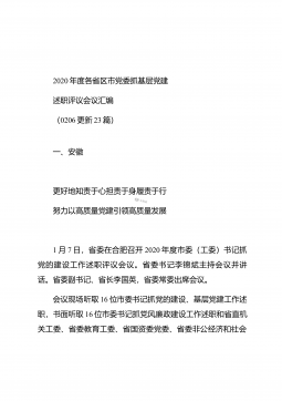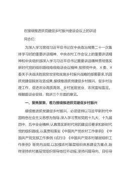在接续推进抓党建促乡村振兴座谈会议上的讲话同志们:为深入学习贯彻习近平总书记在中央政治局第二十一次集体学习时的重要讲话精神、中央农村工作会议上的重要讲话精神和中央组织部深入学习习近平总书记重要讲话精神贯彻落实新时代党的组织路线电视电话会议精神,按照党中央、X委、X委关于决战决胜脱贫攻坚和实施乡村振兴战略的部署要求,巩固抓党建促脱贫攻坚成果,接续推进抓党建促乡村振兴、促乡村治理工作,促进农业高质高效、乡村宜居宜业、农民富裕富足。根据座谈会安排,我讲三个方面的意见。一、聚焦聚集,着力接续推进抓党建促乡村振兴接续推进抓党建促乡村振兴,必须坚持以习近平新时代中国特色社会主义思想为指导,深入学习贯彻党的...
