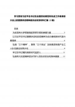 学习贯彻习近平总书记在全国劳动模范和先进工作者表彰大会上的重要讲话精神座谈会发言材料汇编(5篇)目录为实现伟大梦想激荡起思想引领的磅礴力量.........................3以习近平总书记重要讲话和回信精神为动力奏响新时代奋斗最强音...............................................................................................6弘扬“三个精神”、聚焦“三个突出”加快推进铁路产业工人队伍建设改革步伐................................................