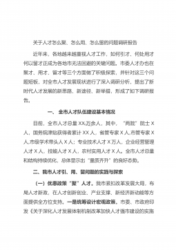 关于人才怎么聚、怎么用、怎么留的问题调研报告近年来,各地越来越重视人才工作,如何引才、何处用才何以留才正成为各地市无法回避的关键问题。市委人才办也在聚才、用才、留才等三个方面做了积极探索,并针对这三个问题短板,对全市人才发展现状进行了深入调研分析,提出了新时代人才发展的新思路、新途径、新举措,形成了如下调研报告。一、 全市人才队伍建设基本情况目前,全市人才总量XX万余人,其中,“两院”院士X人,国务院津贴获得者累计XX人,省管专家X人,市管专家X人,市级学术带头人X人;专业技术人才X万人,企业经营管理人才X人,技能人才X人,农村实用人才X人。全市人才总量和结构持续优化,总体显示出“量质齐升”的...