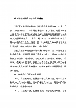 组工干部加强党性修养党课讲稿习近平总书记深刻指出:“党性是党员干部立身、立业、立言、立德的基石”“干部的党性修养、思想觉悟、道德水平不会随着党龄的积累而自然提高,也不会随着职务的升迁而自然提高,而需要终生努力”。今年1月22日,习近平总书记在十九届中央纪委五次全会上强调,要“以庆祝建党100周年为契机,引导党员、干部加强党性锻炼、党性修养”。加强党性修养是党员干部一生的必修课。组工干部作为管党员的党员、管干部的干部、管人才的人才,理应也必须带头加强党性锻炼、党性修养,时时刻刻处处讲党性、重品行、作表率。今天的专题党课,我重点结合自己从事组织人事工作十几年来的真实感悟和切身体会,就组工干部加强党...