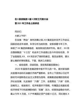 在X旅游集团X届X次职工代表大会暨2021年工作会上的讲话同志们:大家上午好!在全国“两会”胜利闭幕之际,XX集团及时召开工作会议,回顾总结去年成绩,科学分析当前形势,安排部署今年工作,体现了XX集团拼搏奋进、高效务实的良好作风。刚才,XX同志围绕集团“十三五”和去年工作成绩以及今年目标任务,作了全面报告,XX、XX同志讲了很好的意见,我完全赞同,请大家认真抓好贯彻落实。下面,我讲三点意见:一、肯定成绩,总结经验,坚定高质量发展信心2020年是我市发展进程中极不平凡的一年。面对新冠肺炎疫情冲击和石油量价齐跌严重影响,全市上下坚持以习近平新时代中国特色社会主义思想为指导,统筹推进疫情防控和经济社...