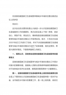 在迎接创建国家卫生县城复审暨城乡环境综合整治推进会议上的讲话同志们:这次会议的主要目的是让大家进一步认识迎接创建国家卫生县城复审工作的重要性,再次动员全县上下统一思想,坚定信心,再鼓干劲,再加压力,确保我县迎接创建国家卫生县城复审和城乡环境综合整治工作取得实效。刚才,X同志对全县2020年创卫工作进行了总结,并对下步迎接创建国家卫生县城复审与城乡环境综合整治行动作了安排部署,我完全赞同,希望大家抓好落实。下面我再强调三点意见。一、提高认识,深刻领会迎接创建国家卫生县城复审的重要意义迎接创建国家卫生县城复审与城乡环境综合整治工作是乡村振兴的重要命题,是提高人民群众获得感幸福感的重要载体,对于加快...