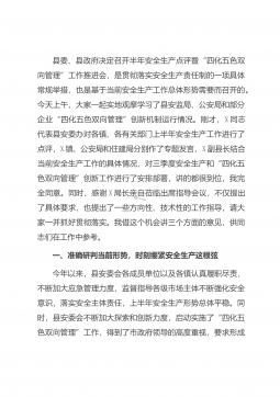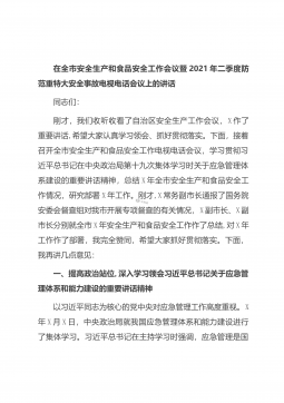 在全市安全生产和食品安全工作会议暨2021年二季度防范重特大安全事故电视电话会议上的讲话同志们:刚才,我们收听收看了自治区安全生产工作会议,X作了重要讲话,希望大家认真学习领会、抓好贯彻落实。下面,接着召开全市安全生产和食品安全工作电视电话会议,学习贯彻习近平总书记在中央政治局第十九次集体学习时关于应急管理体系建设的重要讲话精神,总结X年全市安全生产和食品安全工作情况,研究部署X年工作。刚才,X常务副市长通报了国务院安委会督查组对我市开展专项督查的有关情况,X副市长、X副市长分别就全市X年安全生产和食品安全工作作了总结,对X年工作作了部署,我完全赞同,希望大家抓好贯彻落实。下面,我再讲几点意见...