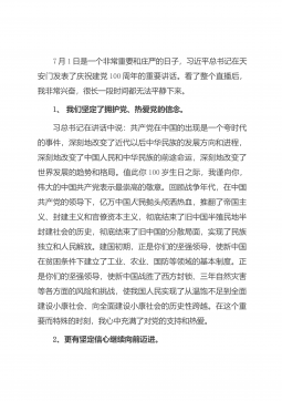7月1日是一个非常重要和庄严的日子,习近平总书记在天安门发表了庆祝建党100周年的重要讲话。看了整个直播后,我非常兴奋,很长一段时间都无法平静下来。1、我们坚定了拥护党、热爱党的信念。习总书记在讲话中说:共产党在中国的出现是一个夸时代的事件,深刻地改变了近代以后中华民族的发展方向和进程,深刻地改变了中国人民和中华民族的前途命运,深刻地改变了世界发展的趋势和格局。值此你100岁生日之际,我谨向你,伟大的中国共产党表示最崇高的敬意。回顾战争年代,在中国共产党的领导下,亿万中国人民抛头颅洒热血,推翻了帝国主义、封建主义和官僚资本主义,彻底结束了旧中国半殖民地半封建社会的历史,彻底结束了旧中国的分散局...