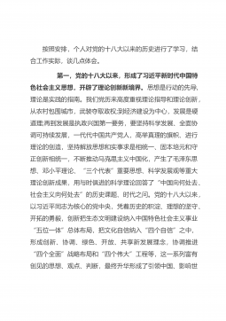 按照安排,个人对党的十八大以来的历史进行了学习,结合工作实际,谈几点体会。 第一,党的十八大以来,形成了习近平新时代中国特色社会主义思想,开辟了理论创新新境界。思想是行动的先导,理论是实践的指南。我们党历来高度重视理论指导和理论创新,从农村包围城市,武装夺取政权;到经济建设为中心,发展是硬道理;再到发展是执政兴国第一要务,要坚持科学发展、全面协调可持续发展,一代代中国共产党人,高举真理的旗帜、进行理论的创造,坚持解放思想和实事求是相统一、固本培元和守正创新相统一,不断推动马克思主义中国化,产生了毛泽东思想、邓小平理论、“三个代表”重要思想、科学发展观等重大理论创新成果,用与时俱进...