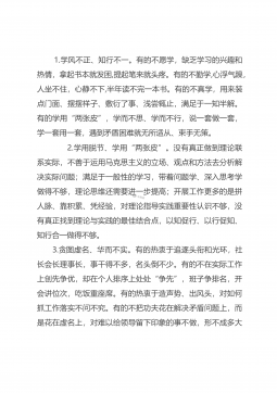 1.学风不正、知行不一。有的不愿学,缺乏学习的兴趣和热情,拿起书本就发困,提起笔来就头疼。有的不勤学,心浮气躁,人坐不住,心静不下,半年读不完一本书。有的不真学,用来装点门面、摆摆样子、敷衍了事、浅尝辄止,满足于一知半解。有的学用“两张皮”,学而不思、学而不行,说一套做一套,学一套用一套,遇到矛盾困难就无所适从、束手无策。 2.学用脱节、学用“两张皮”。没有真正做到理论联系实际,不善于运用马克思主义的立场、观点和方法去分析解决实际问题;满足于一般性的学习,带着问题学、深入思考学做得不够,理论思维还需要进一步提高;开展工作更多的是拼人脉、靠积累、凭经验,对理论指导实践重要性认识不够,没有真正...