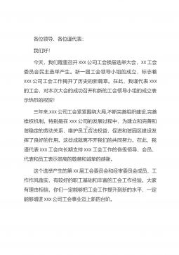 各位领导、各位谨代表:我们好!今天,我们隆重召开XXX公司工会换届选举大会,XX工会委员会民主选举产生。新一届工会领导小组的成立,标志着XXX公司工会工作揭开了历史的新篇章。在此,我谨代表XXX的工会,对本次大会的成功召开和新的工会领导小组的成立表示热烈的祝贺!三年来,XXX公司工会紧紧围绕大局,不断完善组织建设,完善维权机制。特别是在XXX公司的发展过程中,为建立和完善和谐稳定的劳动关系,维护员工合法权益,促进和谐园区建设发挥了良好的作用。这些成就离不开我们的共同努力。在此,我谨代表XXX工会向长期支持XXX工会工作的各级领导、会员、代表和员工表示崇高的敬意和诚挚的感谢。这个选举产生的第XX...