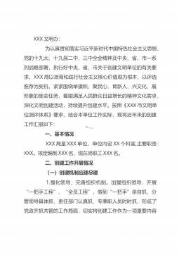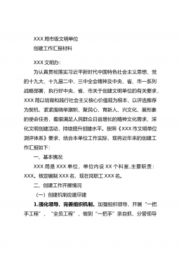 XXX局市级文明单位创建工作汇报材料XXX文明办:为认真贯彻落实习近平新时代中国特色社会主义思想、党的十九大、十九届二中、三中全会精神及中央、省、市一系列战略部署,执行好中央、省、市关于创建文明单位的有关要求,XXX局以培育和践行社会主义核心价值观为根本,以评选推荐为契机,紧紧围绕举旗帜,聚民心、育新人、兴文化、展形象的使命任务,着眼满足人民群众日益增长的精神文化需求,深化文明创建活动,持续提升创建水平。按照《XXX市文明单位测评体系》要求,结合本单位工作实际,现将近年来的创建工作汇报如下:一、基本情况XXX局是XXX单位,单位内设XX个科室,主要职责:XXX。核定编制XXX名,现在岗职工XX...