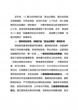 近年来,XXX着力在持续打造“政治过硬型、理论自觉型、本领高强型、作风优良型、担当作为型”上下功夫,深入探索模范机关创建的“党校模式”,为更好服务自治区党委政府中心工作、促进党校高质量发展提供了有力保障。去年,被选树为XXX首批“创建模范机关示范单位”,连续第三次蝉联“全国文明单位”荣誉称号。一、坚持党校姓党,持续打造“政治过硬型”模范机关党校姓党是党校最根本的原则、最独特的优势,也是做好党校工作的根本遵循。坚持党校姓党,带头讲政治,这是党校创建模范机关的“第一标准”。一是夯实讲政治的根基。党校肩负干部培训的重要职责,是传播马克思主义的主阵地,坚持“讲政治者首先讲政治”“教育者首先受教育”,开...