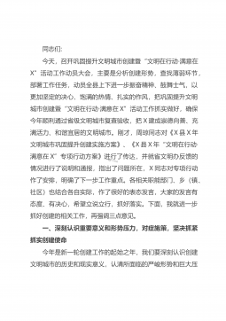 同志们:今天,召开巩固提升文明城市创建暨“文明在行动·满意在X”活动工作动员大会,主要是分析创建形势,查找薄弱环节,部署工作任务,动员全县上下进一步振奋精神、鼓舞士气,以更加坚定的决心、饱满的热情、扎实的作风,把巩固提升文明城市创建暨“文明在行动·满意在X”活动工作抓实做好,确保今年顺利通过省级文明城市复查验收,把X建成崇德向善、充满活力、和谐宜居的文明城市。刚才,周琼同志对《X县X年文明城市巩固提升创建实施方案》、《X县X年“文明在行动·满意在X”专项行动方案》进行了传达,并就省文明办反馈的情况进行了说明和通报,指出了问题所在,X同志对专项行动作了安排,明确了下一步工作重点。各相关职能部门、...