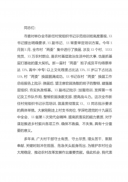 同志们:市委对举办全市新任村党组织书记示范培训班高度重视,XX书记提出明确要求,XX副书记、XX常委审定培训方案。今年X月到X月,全市村“两委”集中进行了换届,涉及XX个村、XXXX党员、XX万农村群众,是农村基层政治生活中的大事,也是抓基层打基础的重大契机。新一届村“两委”班子成员平均得票率达XX%,高中(中专)以上文化程度占比达XX%,35岁以下占比达XX%,村“两委”换届圆满成功。XX书记在村“两委”换届工作总结报告上批示:换届后,望注意软弱涣散的班子的整顿,建强基层组织,夯实执政根基。XX副书记批示:加强培训,发挥第一书记及工作队作用,整顿软弱涣散支部,提高战斗力。这次全市新任村党组织...