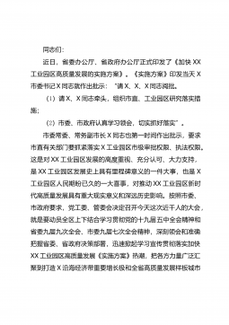 同志们:近日,省委办公厅、省政府办公厅正式印发了《加快XX工业园区高质量发展的实施方案》。《实施方案》印发当天X市委书记X同志就作出批示:“请X、X、X同志阅批。(1)请X、X同志牵头,组织市直、工业园区研究落实措施;(2)市委、市政府认真学习领会,切实抓好落实”。市委常委、常务副市长X同志也第一时间作出批示,要求市直有关部门要抓紧落实X工业园区市级审批权限、执法权限。这是对XX工业园区发展的高度重视、充分认可、大力支持,是XX工业园区发展史上具有里程碑意义的一件大事,也是X工业园区人民期盼已久的一大喜事,对推动XX工业园区新时代高质量发展具有重大现实意义和深远历史影响。按照市委、市政府要求,...