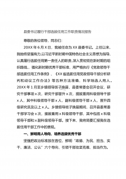 县委书记履行干部选拔任用工作职责情况报告尊敬的各位领导,同志们:20XX年6月X日,我被任命为XX县委书记。上任以来,我始终坚强有力,以习近平新时期中国特色社会主义思想为指导,认真履行选拔任用第一责任人的职责,深入贯彻党在新时期的组织路线,,强化新时期优秀干部标准,用严格执行《党政领导干部选拔任用工作条例》、《XX省选拔任用党政领导干部分析研判和动议工作办法》等五种方法准确、科学地选人用人。20XX年1月至乡镇领导班子换届,县委常委会召开会议,研究干部事项x次,研究干部晋升x次,提拔重用科级领导干部x人,其中科级领导干部x人,副科级领导干部x人,晋升四级研究员及以上x人。乡镇领导班子换届期间,...