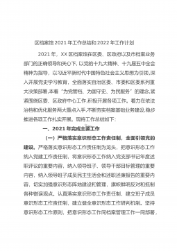 区档案馆2021年工作总结和2022年工作计划 2021年,XX区档案馆在区委、区政府以及市档案业务部门的正确领导和关心下,以党的十九大精神、十九届五中全会精神为指导,以习近平新时代中国特色社会主义思想为引领,深入开展党史学习教育,全面落实自治区委、市委和区委系列重大决策部署,本着“为党管档、为国守史、为民服务”的理念,紧紧围绕区委、区政府中心工作,积极开展各项工作。着力在依法治档和优化服务两大重点入手,不断夯实档案基础业务建设,稳步推进各项工作扎实开展。现将工作总结如下: 一、2021年完成主要工作 (一)严格落实意识形态工作责任制,全面引领党的建设。严格落实意识形态工作责任制为龙...
