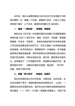 近年来,我们认真贯彻落实习总书记关于机关党建工作的指示精神,在“建强一个机制、紧握两个抓手、力促三个到位、坚持四个强化”上下功夫,推进机关党建工作上新台阶。一、建强“一套机制”,抓调度、强督查制定出台《关于进一步加强市直机关党建工作调度督查和考核方案(试行)》系列文件,做到“月自评、月抽查,季调度、季通报,年总评、年排序”。各单位党组织每月对本单位党建工作任务完成情况进行自评打分,机关工委按X%比例组织抽查,如有虚假,则予双倍扣分;每季度召开一次调度会,并书面通报各单位季度考核结果;每年对各单位日常考核得分进行统计,并进行民主测评,同时还设加分项、减分项,最后得出年度总分。这样推动了“工作调度...