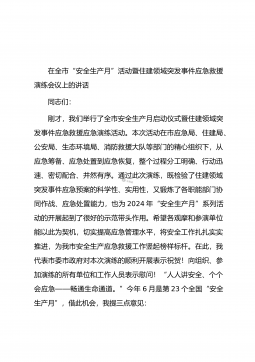 在全市“安全生产月”活动暨住建领域突发事件应急救援演练会议上的讲话同志们:刚才,我们举行了全市安全生产月启动仪式暨住建领域突发事件应急救援应急演练活动。本次活动在市应急局、住建局、公安局、生态环境局、消防救援大队等部门的精心组织下,从应急筹备、应急处置到应急恢复,整个过程分工明确、行动迅速、密切配合、井然有序。通过此次演练,既检验了住建领域突发事件应急预案的科学性、实用性,又锻炼了各职能部门协同作战、应急处置能力,也为2024年“安全生产月”系列活动的开展起到了很好的示范带头作用。希望各观摩和参演单位能以此为契机,切实提高应急管理水平,将安全工作扎扎实实推进,为我市安全生产应急救援工作竖起榜样...