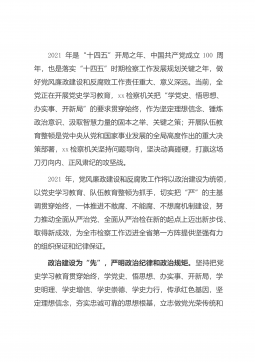 2021年是“十四五”开局之年、中国共产党成立100周年,也是落实“十四五”时期检察工作发展规划关键之年,做好党风廉政建设和反腐败工作责任重大、意义深远。当前,全党正在开展党史学习教育,xx检察机关把“学党史、悟思想、办实事、开新局”的要求贯穿始终,作为坚定理想信念、锤炼政治意识、汲取智慧力量的固本之举、关键之策;开展队伍教育整顿是党中央从党和国家事业发展的全局高度作出的重大决策部署,xx检察机关坚持问题导向,坚决动真碰硬,打赢这场刀刃向内、正风肃纪的攻坚战。2021年,党风廉政建设和反腐败工作将以政治建设为统领,以党史学习教育、队伍教育整顿为抓手,切实把“严”的主基调贯穿始终,一体推进不敢腐...
