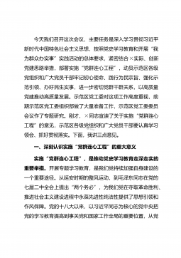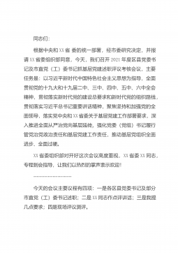 同志们:根据中央和XX省委的统一部署,经市委研究决定,并报请XX省委组织部同意,今天,我们召开2021年度区县党委书记及市直党(工)委书记抓基层党建述职评议考核会议,主要任务是:以习近平新时代中国特色社会主义思想为指导,全面贯彻党的十九大和十九届二中、三中、四中、五中、六中全会精神,贯彻落实新时代党的建设总要求和新时代党的组织路线,贯彻落实习近平总书记重要讲话精神,聚焦坚持和加强党的全面领导,落实党中央和XX省委关于基层党建工作部署要求,深入推进全面从严治党向基层延伸,强化党委(党组)书记履行管党治党政治责任和基层党建工作责任,推动基层党组织全面进步、全面过硬。XX省委组织部对开好这次会议高度...