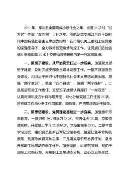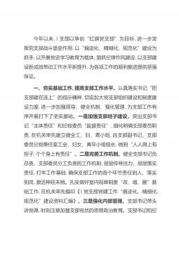 今年以来,X支部以争创“红旗党支部”为目标,进一步发挥党支部战斗堡垒作用,以“痕迹化、精细化、规范化”建设为抓手,以开展党史学习教育为载体,狠抓纪律作风建设,以支部建设新成效带动工作水平新提升,为各项工作的顺利推进提供坚强保证。一、夯实基础工作,提高支部工作水平。认真落实书记“把支部建在连上”的指示精神,切实加大党支部组织建设和制度建设力度,进一步加强领导、健全机制、强化管理,为支部工作有序开展打下了坚实基础。一是加强支部班子建设。突出支部书记“主体责任”和纪检委员“监督责任”,细化明确支部委员职责,在机关率先建立健全工、妇、青小组,由支部副书记、支部委员分别兼任室工会、妇女、青年小组组长,做...