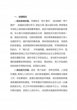 一、述德情况1.政治忠诚方面。牢固树立“四个意识”,坚决做到“两个维护”,加强政治理论学习,顾全大局,服从组织决定,贯彻落实中央和上级党委决策部署等情况。坚定不移地贯彻党的基本路线,在大是大非面前站稳政治立场,做到坚决与党中央保持一致,做到对党忠诚,对新时期党章、党纪等规章制度进行深入全面的学习。维护党的形象权威、宣传党的政策主张、巩固党的执政基础。自觉做到将纪律和规矩挺在前面,并将其高标准的执行,不“随大流”,不机械照搬。具体到学校工作中,就是要始终坚持以习近平新时代中国特色社会主义思想为引领,体现在履职尽责、做好本职工作的实效上,坚决把中央和省市委的部署要求贯彻到位、执行到位、落实到位,用...