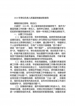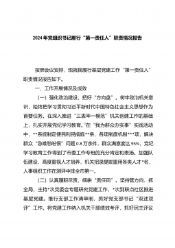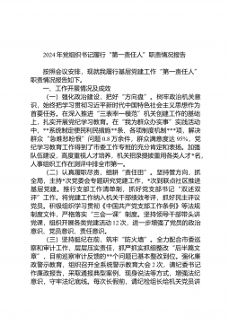 2024年党组织书记履行“第一责任人”职责情况报告 按照会议安排,现就我履行基层党建工作“第一责任人”职责情况报告如下。 一、工作开展情况及成效 (一)强化政治建设,把好“方向盘”。树牢政治机关意识,始终把学习贯彻习近平新时代中国特色社会主义思想作为首要任务。在深入推进“三表率一模范”机关创建工作的基础上,扎实开展党纪学习教育。在“我为群众办实事”实践活动中,**系统制定便民利民措施**条、各项制度机制***项,解决群众“急难愁盼恨”问题0.8万余件,群众满意度达95%,党纪学习教育工作得到了市委工作专班的充分肯定和表扬。加强队伍建设,高度重视人才培养,机关招录提拔重用各类人才*名...