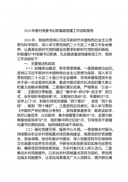 2024年村党支部书记抓基层党建工作述职报告2024年,在镇党委、政府的坚强领导下,本人严格履行党建“第一责任人”职责,团结带领村“两委”班子成员,紧紧围绕中心工作,以提升组织力为重点,以服务群众为核心,扎实开展各项工作,并取得一定成效。一、工作开展情况(一)履职尽责,强化担当,在落实主体责任上下功夫。一是严抓责任落实。严格落实“第一责任人”职责,把党建工作作为核心任务抓紧抓实,全年组织集中学习习近平新时代中国特色社会主义思想、党的二十届三中全会精神以及习近平总书记关于乡村振兴的重要论述16次,开展专题研讨12次,人均撰写心得体会4篇,不断提高党员干部政治判断力、政治领悟力、政治执行力。召开专...