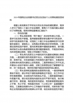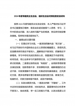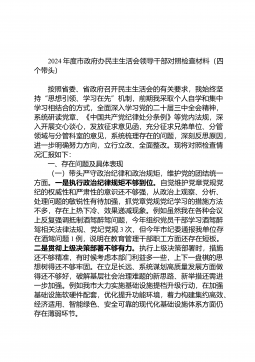 2024年度市政府办民主生活会领导干部对照检查材料(四个带头)按照省委、省政府召开民主生活会的有关要求,我始终坚持“思想引领、学习在先”机制,前期我采取个人自学和集中学习相结合的方式,全面深入学习党的二十届三中全会精神,系统研读党章、《中国共产党纪律处分条例》等党内法规,深入开展交心谈心,发放征求意见函,充分征求兄弟单位、分管领域与分管科室的意见,系统梳理存在的问题,深刻反思原因,进一步明确努力方向,立行立改、全面整改。现将对照检查情况汇报如下:一、存在问题及具体表现(一)带头严守政治纪律和政治规矩,维护党的团结统一方面。一是执行政治纪律规矩不够到位。自觉维护党章党规党纪的权威性和严肃性的意识...