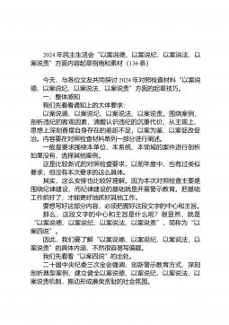 2024年民主生活会“以案说德、以案说纪、以案说法、以案说责”方面内容起草指南和素材(136条)今天,与各位文友共同探讨2024年对照检查材料“以案说德、以案说纪、以案说法、以案说责”方面的起草技巧。一、整体感知我们先看看通知上的大体要求:以案说德、以案说纪、以案说法、以案说责。围绕案例,剖析违纪的客观因素,清醒认识违纪的沉重代价,从主观上、思想上深刻查摆自身存在的差距不足,以案为鉴、以案促改促治。内容要在对照检查材料单列一部分进行阐述。一般是要求围绕本单位、本系统、本领域的案件进行剖析如果没有,选择其他案例。这是比较新式的对照检查要求,以前年度中,也有过类似要求,但没有本次要求的这么具体。其...
