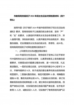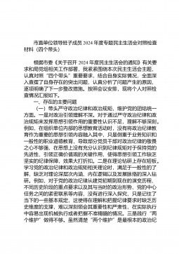 市直单位领导班子成员2024年度专题民主生活会对照检查材料(四个带头)根据市委《关于召开2024年度民主生活会的通知》有关要求和局党组相关工作部署,我紧紧围绕本次民主生活会主题,认真对照“四个带头”重要要求,结合自身实际情况,全面深入查摆了自身存在的突出问题,认真分析了问题产生的原因,逐项明确了下一步整改措施。按照会议安排,现将个人对照检查情况汇报如下。一、存在的主要问题(一)带头严守政治纪律和政治规矩,维护党的团结统一方面。一是对政治引领理解不深。对于通过严守政治纪律和政治规矩来发挥思想引领作用的重要性认识不足,理解不够深刻。例如,在组织单位内部的思想教育活动时,没有将政治纪律教育作为重要的...