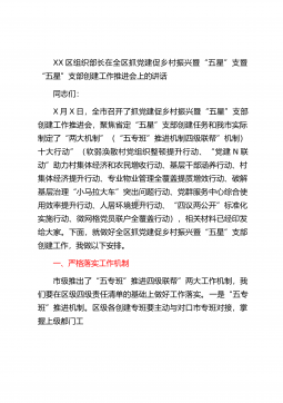 XX区组织部长在全区抓党建促乡村振兴暨“五星”支暨“五星”支部创建工作推进会上的讲话同志们:X月X日,全市召开了抓党建促乡村振兴暨“五星”支部创建工作推进会,聚焦省定“五星”支部创建任务和我市实际制定了“两大机制”(“五专班”推进机制四级联帮”机制)十大行动”(软弱涣散村党组织整顿提升行动、“党建N联动”助力村集体经济和农民增收行动、基层干部涵养行动、村集体经济提升行动、专业物业管理全覆盖提质增效行动、破解基层治理“小马拉大车”突出问题行动、党群服务中心综合使用效率提升行动、人居环境提升行动、“四议两公开”标准化实施行动、微网格党员联户全覆盖行动),相关材料已经印发给大家。下面,就做好全区抓党...
